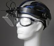 该系统一般是将摄像头固定在头盔的上部,通过半反镜来进行前方场景的观察,拍摄到与同人眼观察一样的视觉效果,并利用头部跟踪器(如Intersense的IS-1200)进行头部跟踪,随后通过计算机将实际采集图像与头部方位所对应的虚拟场景融合,在头盔显示器上显示出来,达到增强显示的效果。通过手柄、传感器等其他交互输入设备完成交互显示功能。|