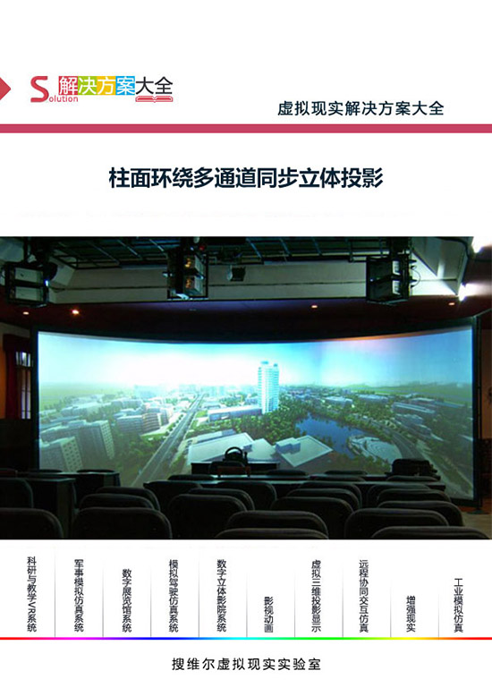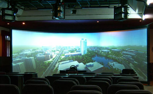 多通道柱面投影显示系统是虚拟三维投影显示系统中一种沉浸式虚拟仿真显示环境,系统采用环形的投影屏幕作为仿真应用的投射载体,所以通常又称为环幕投影系统。根据环形幕半径的大小,通常为120 、135、180、240、270、360度弧度不等,由于其屏幕的显示半径巨大,通常用于一些大型的虚拟仿真应用,比如:虚拟战场仿真、数字城市规划、三维地理信息系统等大型场景仿真环境,近来开始向展览展示、工业设计、教育培训、会议中心等专业领域发展。