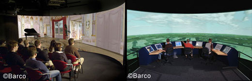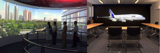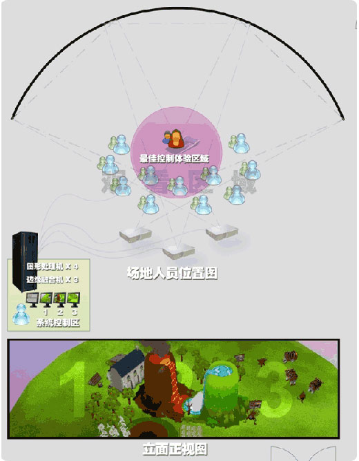 然而,其环幕显示特征导致了它的技术复杂性,通常一个完整的环幕投影系统需要有以下几项强有力的核心技术做支撑:数字几何矫正(即非线性失真矫正)技术、多通道视景同步控制技术、数字图像边缘融合技术,才能成功地将三维图形计算机生成的实时三维数字影像、实时同步地输出并显示在一个具有一定半径和弧度的巨幅环形投影屏幕上,从而形成一个具有 极高分辨率的、无任何变形失真的数字三维立体影像,所以,在众多的虚拟仿真显示系统中多通道环幕投影是一个技术含量极高的显示系统,相反,其隐藏的技术风险也要求用户对供应商的选择慎之又慎;同样由于该系统的环幕显示特征,其具有一定弧度的巨幅显示空间包围了所有参与者的整个观看视野,再配合环绕立体声响系统,可使仿真参与者充分体验一种高度身临其境的三维立体视听感受,获得一个具有高度沉浸感的虚拟仿真可视协同环境。